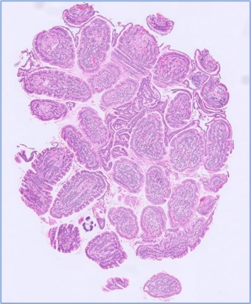 Most of the time, the enterectomy samples we receive are localised lesions detected at surgery, on palpation or via imaging, the aim being to achieve complete removal and potentially cure. Examples include areas of ulceration/perforation, neoplasms, other space-occupying lesions, and intussusception sites.