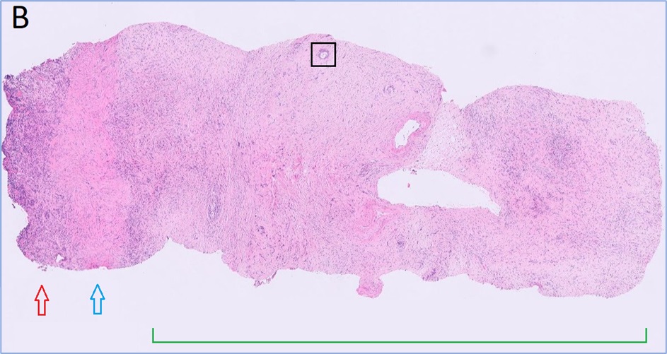 Fig 2. Intestinal resection with mass. Red boxes depict areas sampled, allowing evaluation of margins.