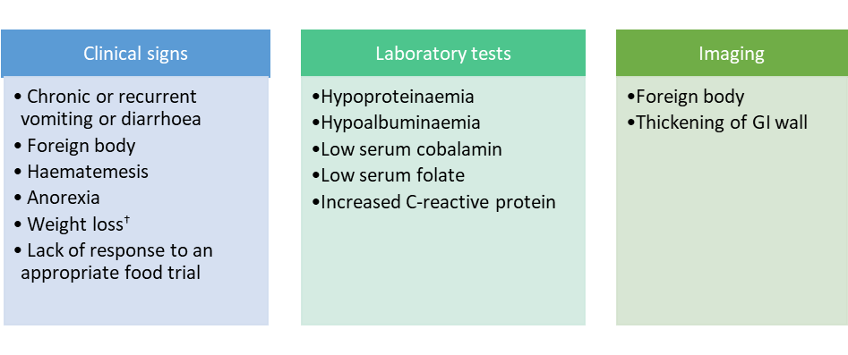 Indications for gastrointestinal biopsy may be based on the clinical presentation of the animal, laboratory test results or other techniques such as imaging